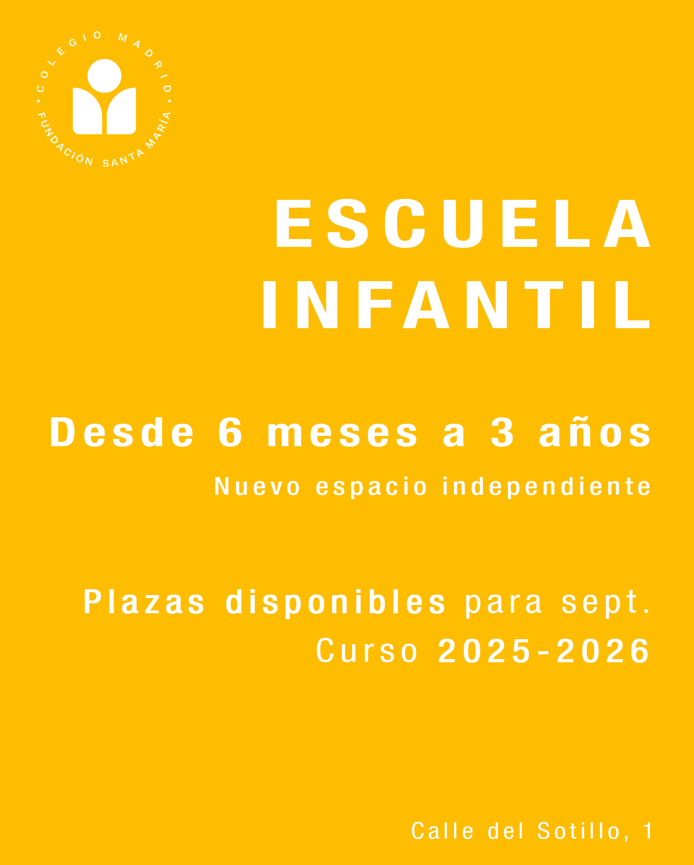 El próximo curso, 2025-2026, arranca la Escuela Infantil del Colegio Madrid – Fundación Santa María. Un espacio independiente para el alumnado de 6 meses a 3 años, en la Calle del Sotillo, 1, a 10 minutos andando de nuestra sede principal en Ronda de Sobradiel, 80.